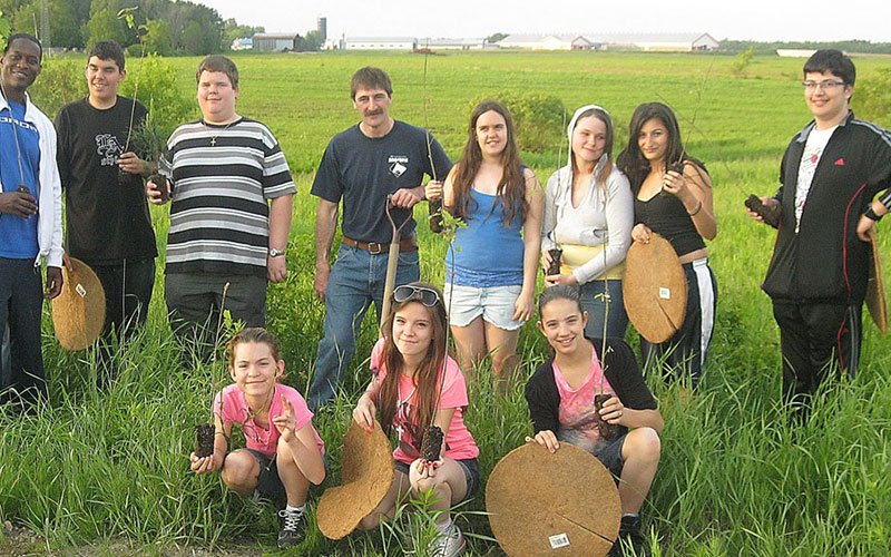 The instigator of the project is Mario Lyonnais, dairy producer and mayor of the municipality of Sainte-Françoise for 14 years. The project was organized in collaboration with the ZIP (Zone d’intervention prioritaire) Les Deux Rives committee, which was responsible for supplying the equipment and providing technical support. A group of students from École St-Martin in Laval provided valuable labour during one of the Educational Farm Visits organized by the municipality. According to the Comité ZIP Les Deux Rives, a non-profit organization that aims to protect and enhance the St. Lawrence River, the Petite rivière du Chêne basin contains some of the most degraded waterways in Quebec. Eight out of ten sites are considered a priority in terms of intervention in the downstream portion of the Petite rivière du Chêne basin. The windbreak hedge planting project is therefore part of a broader objective aimed at improving water quality and preserving the ecosystem functions of the hydrological territory. The Georges Hamel multifunctional trail is named in honour of the famous country singer, a native of Sainte-Françoise. Photo: Courtesy Mario Lyonnais (center), surrounded by students from École St-Martin, Laval, who came to participate in a tree-planting project in Sainte-Françoise.
